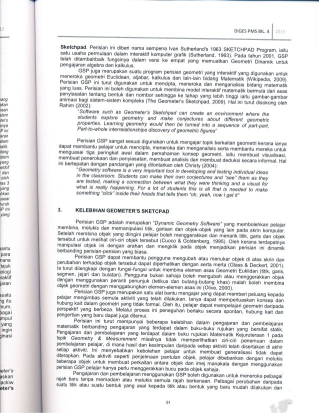 9 Jurutera Perisian Komputer. Oct 18 2014 MASALAH PENGGUNAAN PERISIAN GEOMETERS SKETCHPAD DALAM PENGAJARAN DAN PEM BELAJARAN Masalah penggunaan perisian GSP yang ketara wujud dalam kalangan pendidik yang mengajar matematik iiVataysia adalah kekangan masa untuk menguasai kemahiran bagi perisian GSiterutamanya bagi penOioir yang masih lemah dalam asas kemahiran. Walau bagaimanapun penggunaan perisian GSP di sekolah masih kurang berleluasan serta kajian yang mengenai keberkesanan perisian ini.